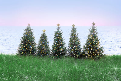Enjoy the peaceful vibes of A COASTAL HOLIDAY with this joyful snap of shimmering Christmas trees in a serene lakeside setting.