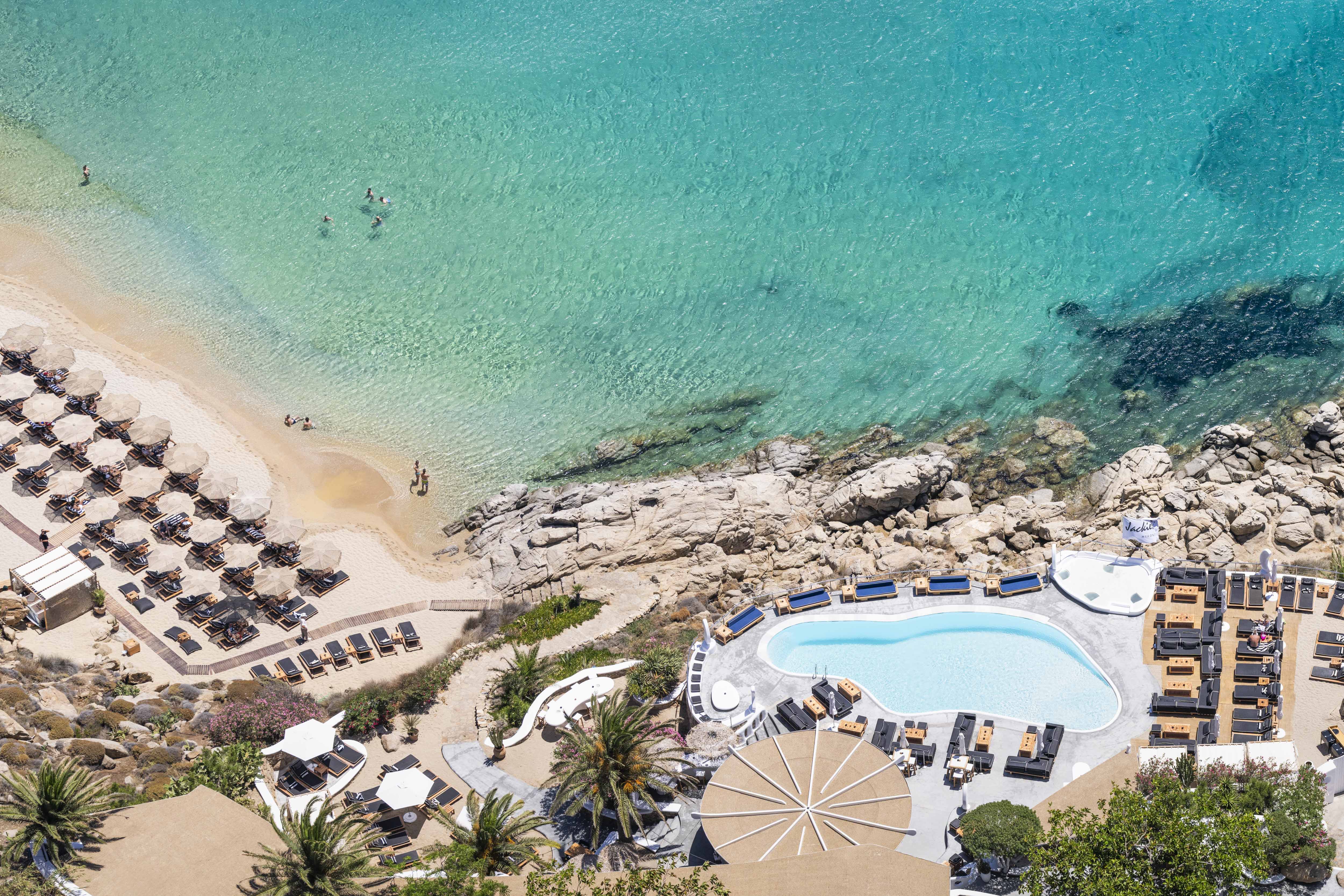 The crystalline blue waters of the sea shine over “Afternoon at JackieO', Mykonos”, a timeless fine art photography print from Gray Malin’s Greek Islands series.