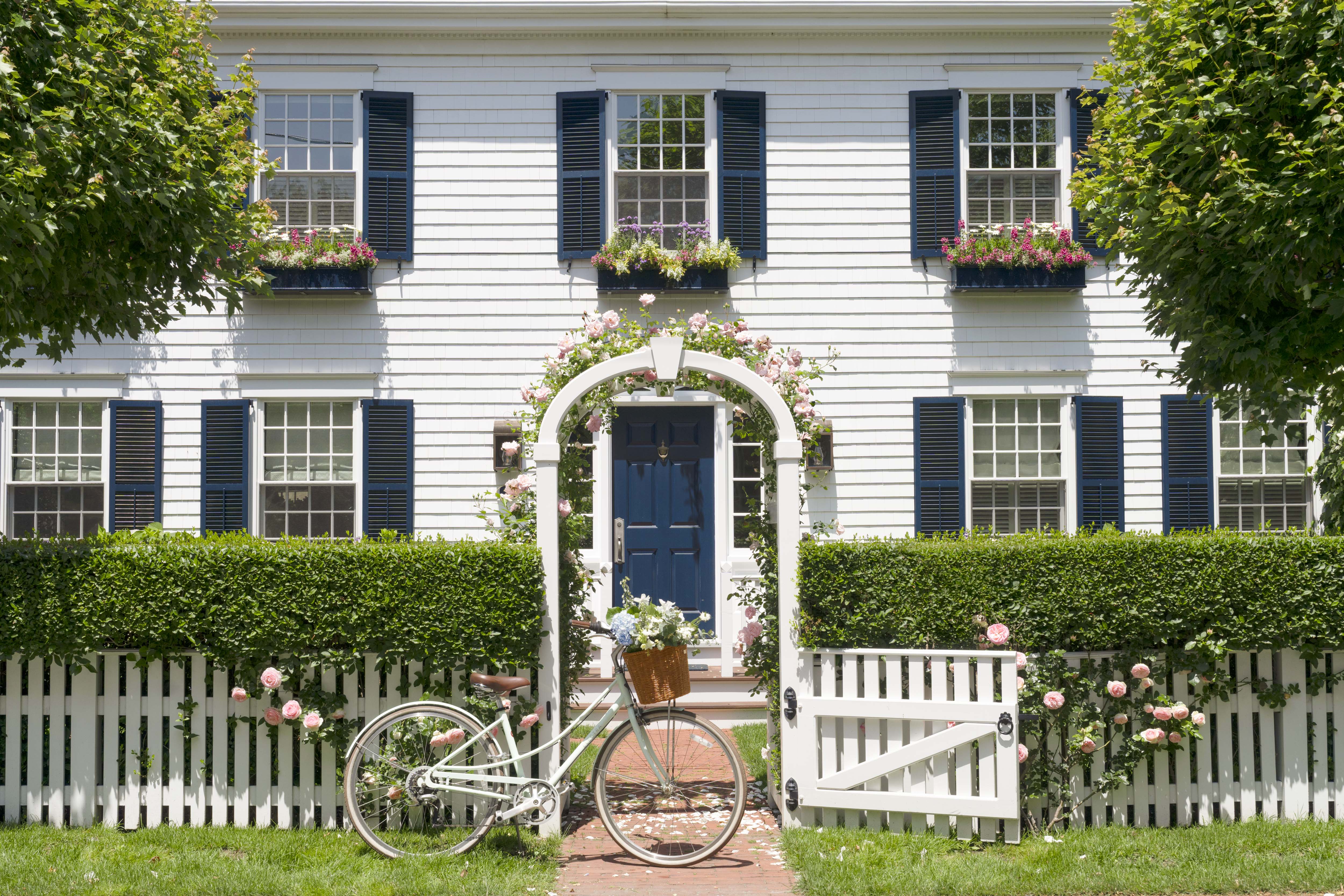 A picture-perfect entrance parked along a picket fence in Afternoon Bike Ride, from the series Gray Malin on Martha’s Vineyard.