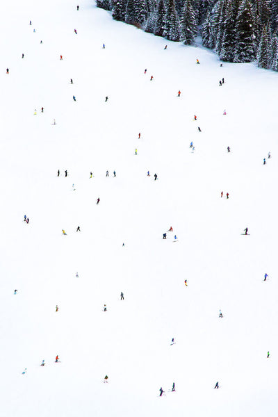 Various speckles of brightly hued skiers decorate the freshly fallen snow in ASPEN SKIERS VERTICAL, a fine art photography print. Gray's popular A la Montagne series, shot from doorless helicopters, showcases the luxe winter bliss found in lavish ski resorts around the world from a unique aerial perspective. He shares, this series is a visual celebration of natural form, color, repetition and winter joy.