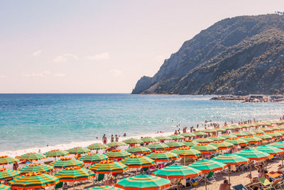 Vivid striped vintage umbrellas wrap around the shoreline in BAGNI EDEN, MONTEROSSO. Bright sandy beaches contrast the rugged cliffs, making for the ultimate Italian scene. Gray, inspired by the glamorous Italian Riviera, captured and created La Dolce Vita series while on a 2,000+ mile road trip through the iconic beaches of Italy.