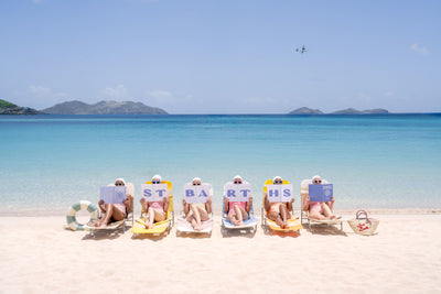 The aqualillies, adorned in retro swimwear and accessorized with timeless elegance, effortlessly exude the grace and poise of a bygone era while reading up on the timeless beauty of St. Barths' natural beauty at its finest in BATHING BEAUTIES, ST. JEAN BAY, ST. BARTHS, from the enchanting series Gray Malin on St. Barths.