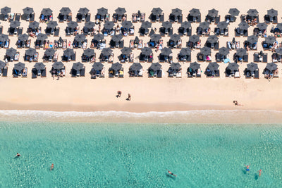 Relax by the sea under an umbrella in “Black Umbrellas, Elia Beach, Mykonos” a timeless fine art photography print from Gray Malin’s Greek Islands series.