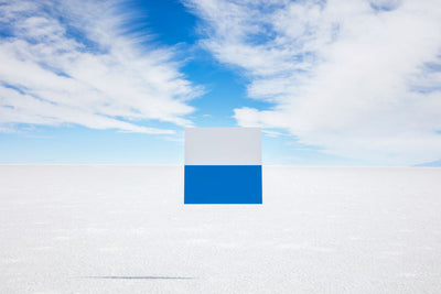 A BLUE AND WHITE SQUARE pops against the dichromatic surroundings in Part III of Gray's whimsical Far Far Away series.