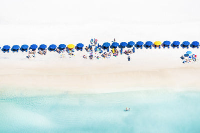 Pops of sunshine in a sea of blue with BLUE AND YELLOW UMBRELLAS, ROSEMARY BEACH, 30A FLORIDA Gray’s iconic √Å la Plage series.