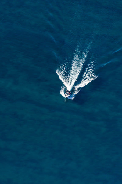 With the sun shining overhead, cruise along royal blue waters in BOAT DAY, LAKE TAHOE, from Gray’s popular À la Plage series.