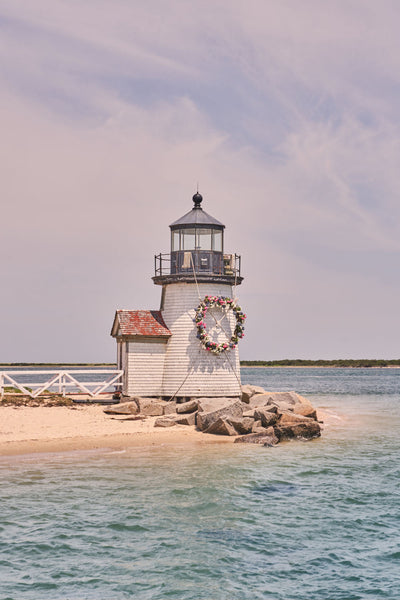 Enjoy a floral touch to a classic landmark in BRANT POINT LIGHTHOUSE WREATH VERTICAL, NANTUCKET from the series Gray Malin on Nantucket.