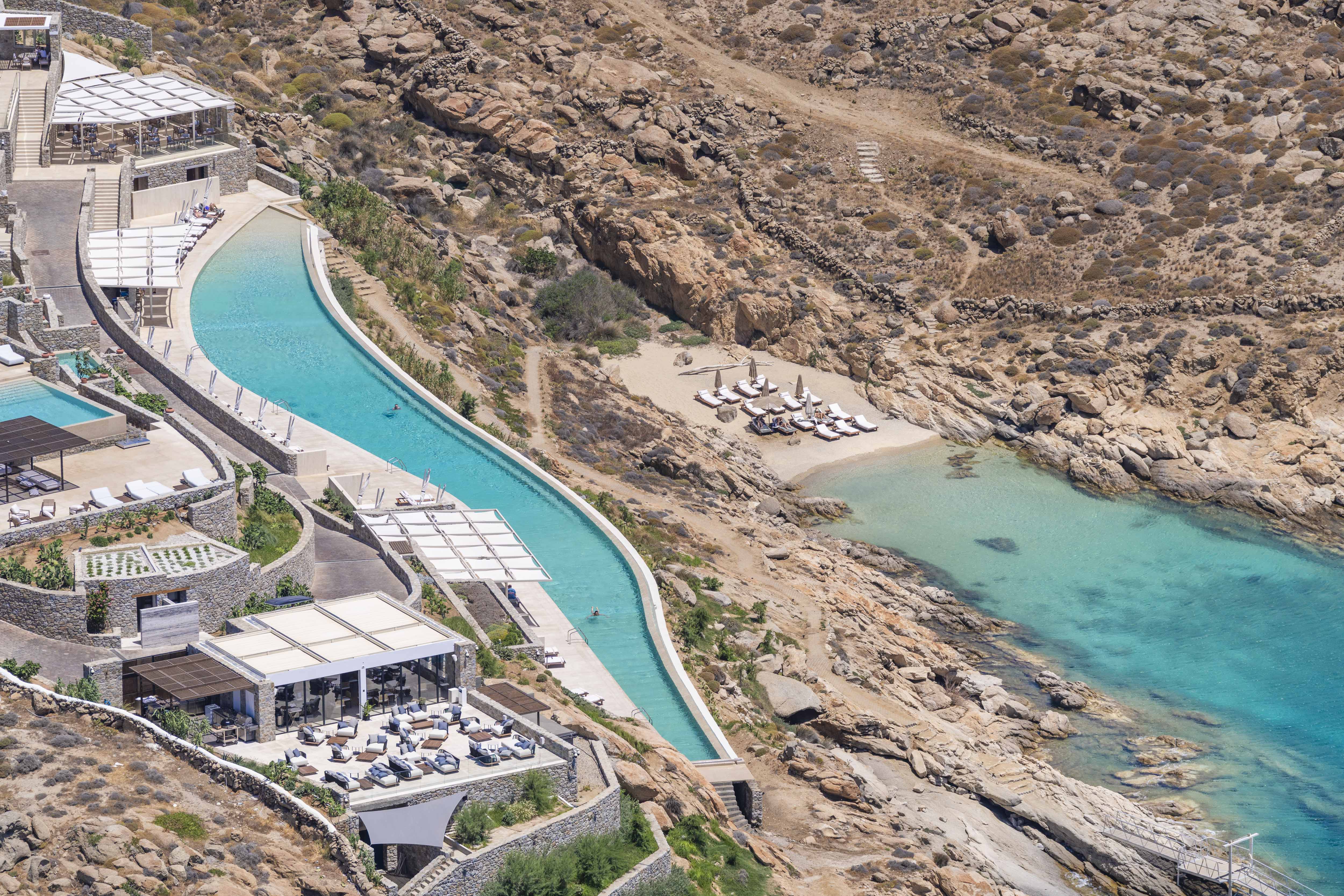 Take in a stunning pool and oceanfront scene in “Cali Mykonos” a timeless fine art photography print from Gray Malin’s Greek Islands series.