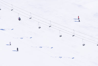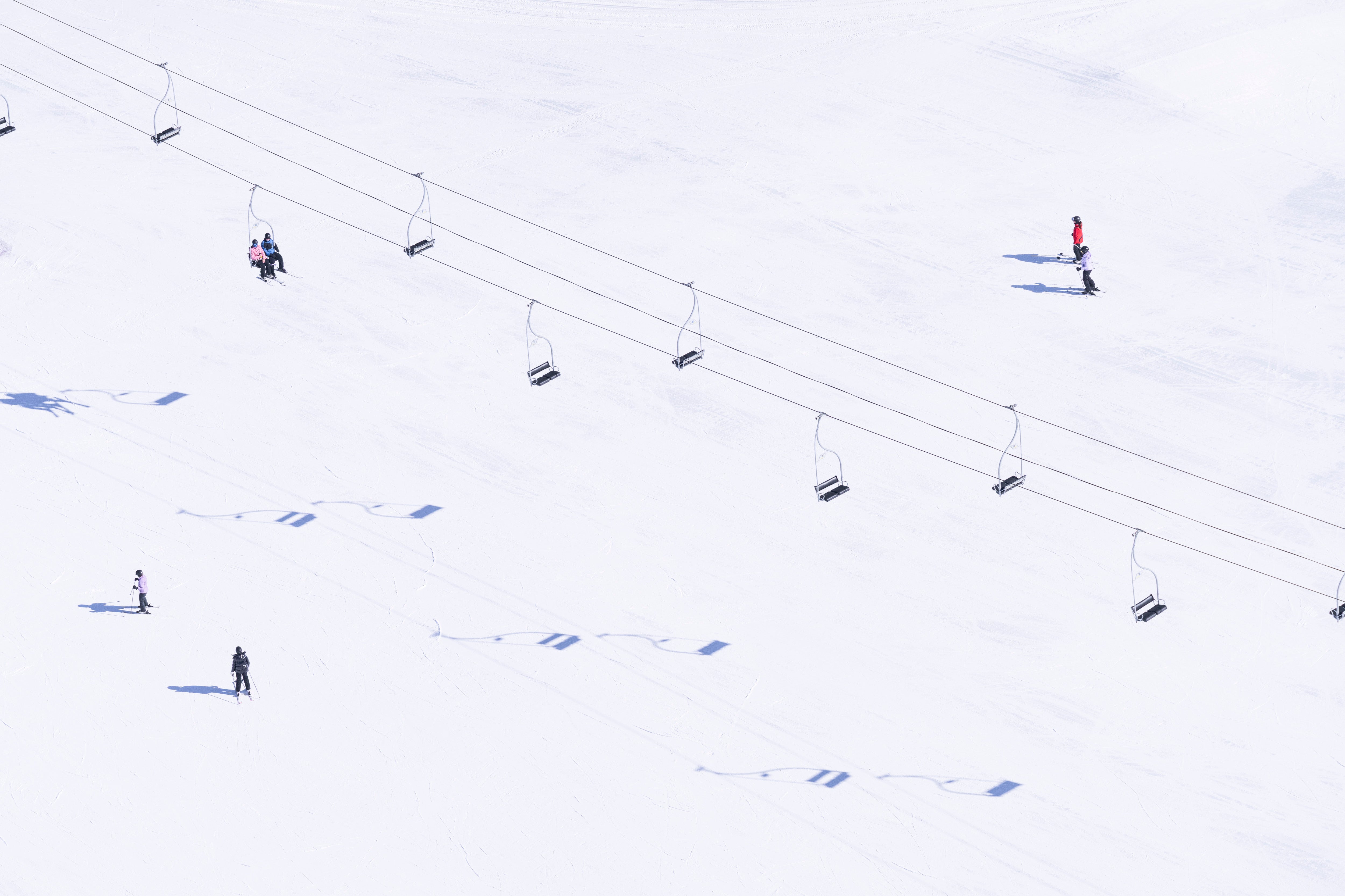 A graphic study of chairs, skiers, and long winter silhouettes in Chairlift Shadows, from Gray’s iconic series, À la Montagne.