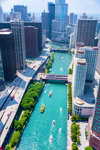 Enjoy a boat day admiring the beautiful city skyline in CHICAGO RIVER from Gray’s iconic series, Au Parc.