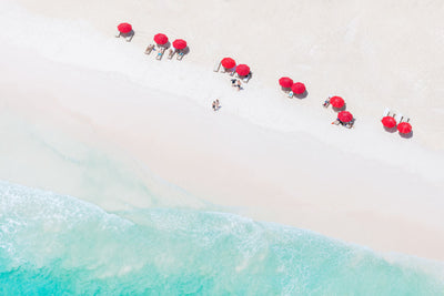 Delight in a playful pop of red with CORAL SANDS RED UMBRELLAS, HARBOUR ISLAND from Gray’s beloved aerial beach series, À la Plage.