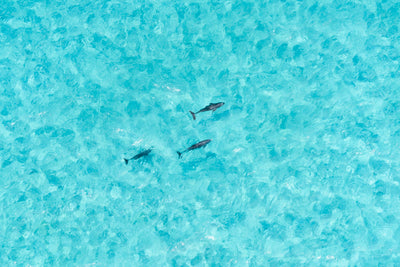 Enjoy the playful energy of these majestic creatures in "Dolphin Swim, Abaco, Bahamas", a fine art photography print from Gray Malin’s “A la plage” series.
