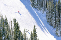 Two skiers glide down the mountain in Double Descent, Ajax Mountain from Gray’s iconic series, À la Montagne.