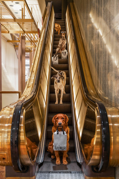 Dallas’ best dressed dogs descend a gilded escalator on a fabulous day of shopping at the iconic shopping destination in Escalator Ride, Neiman Marcus, Downtown Dallas from Gray’s playful series, Gray Malin at Neiman Marcus.