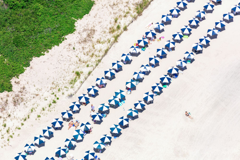 Stunning navy and white umbrellas line the white sand beach in FISHERS ISLAND CLUB from Gray’s beloved aerial series, À la Plage.