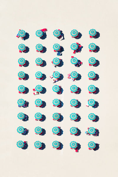 Iconic retro-vintage striped umbrellas coordinate with the sandy beach in FORTY FIVE UMBRELLAS, ITALY. Add a feeling of rhythm and uniformity to any space with this green and orange striped umbrella scene.