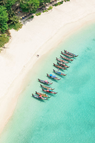 Dock the long-tail boats on the white sands of FREEDOM BEACH, THAILAND, shot from a doorless helicopter by Gray for his iconic series, Á la Plage.