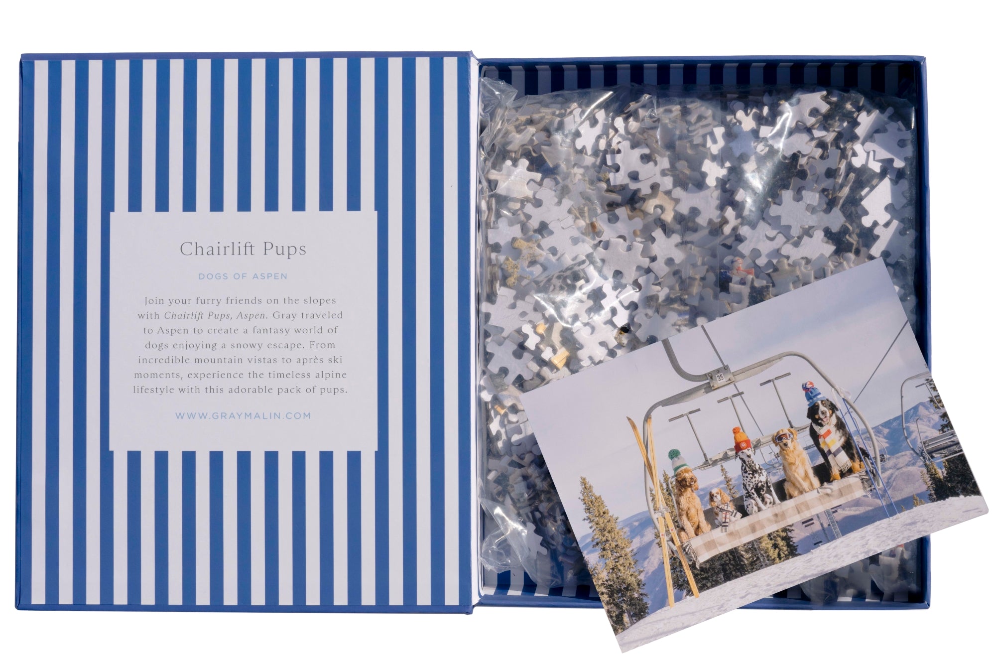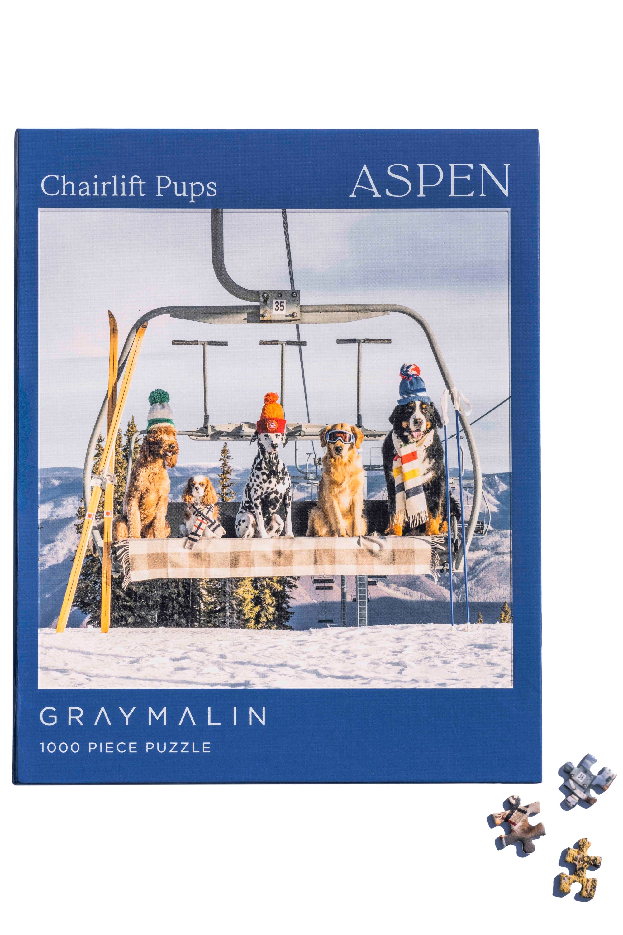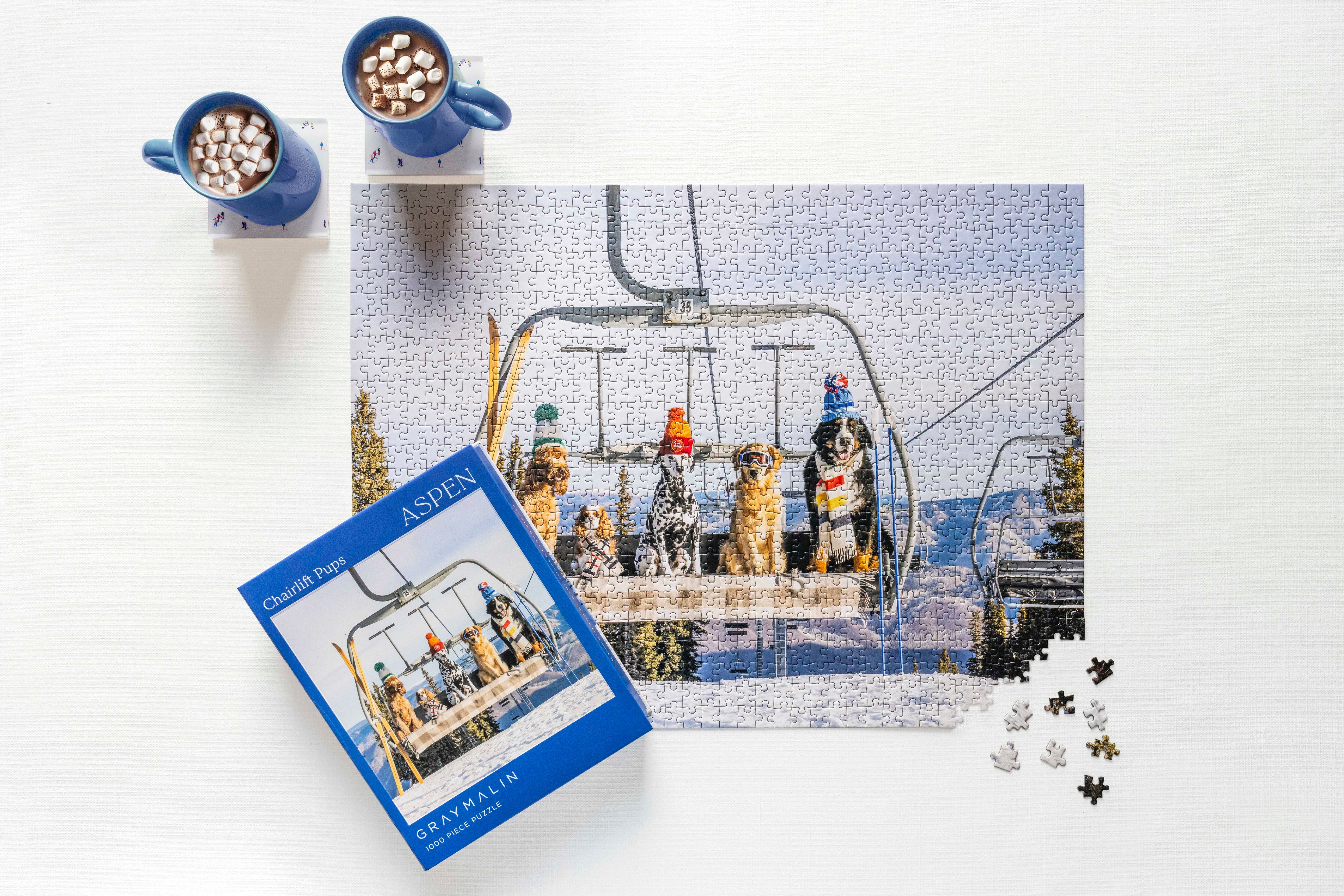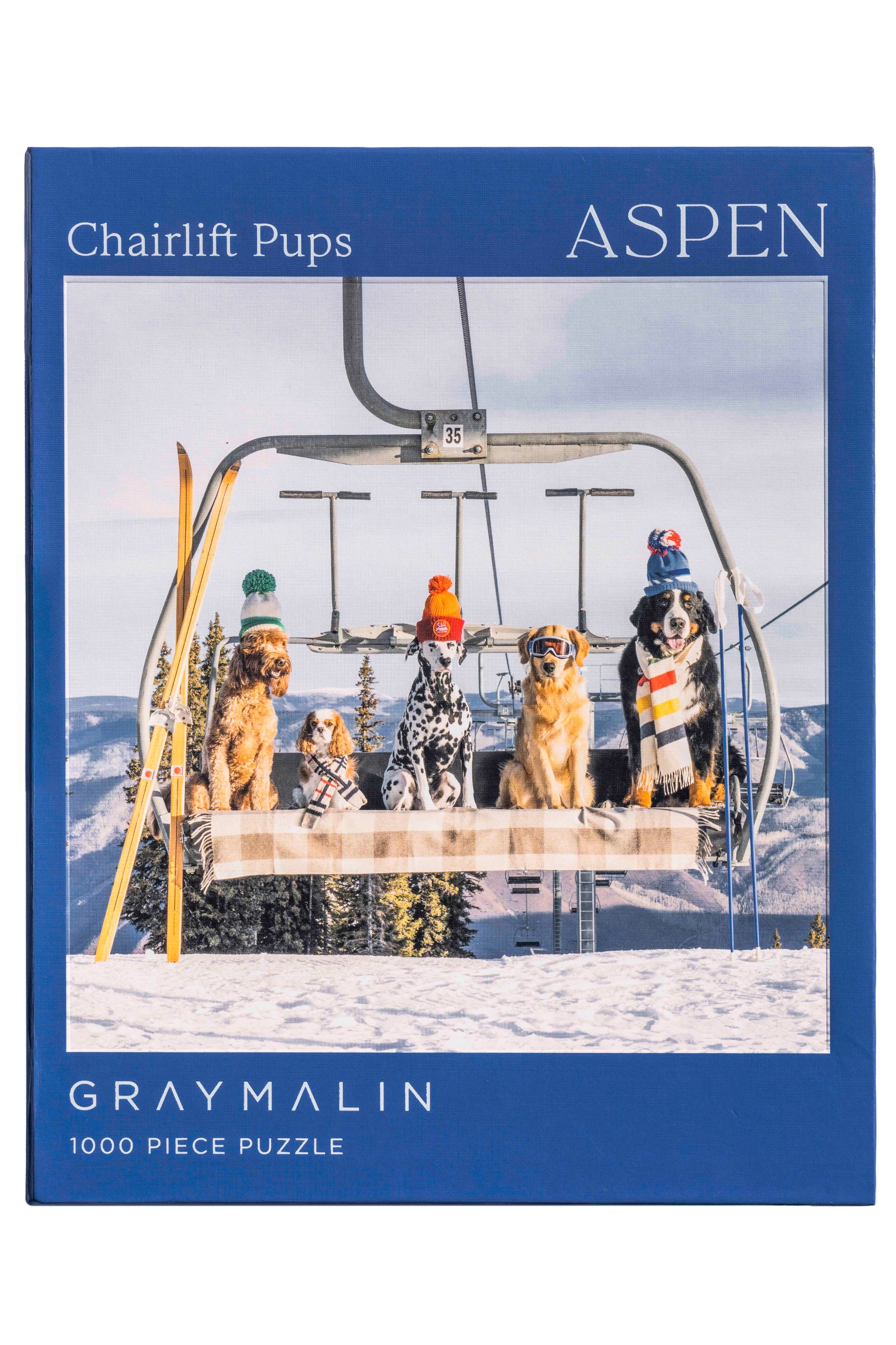 Read MorePerfect for puzzle and fine art photography enthusiasts alike, Gray Malin Aspen 1000 Piece Book Box Puzzle features "Chairlift Pups, Aspen" from Gray’s best-selling collection, Dogs of Aspen. Completed puzzle is 18" x 24" in dimensions.