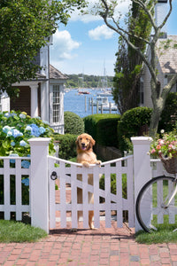 A golden retriever pup greets you at the gate as boats pass by in the distance in Harbor Hello, from the series Gray Malin on Martha’s Vineyard.
