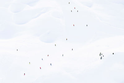 Ski into the next run on the snow covered alps in LA PLAGNE SKIERS, FRENCH ALPS from Gray’s A la Montagne photography series.