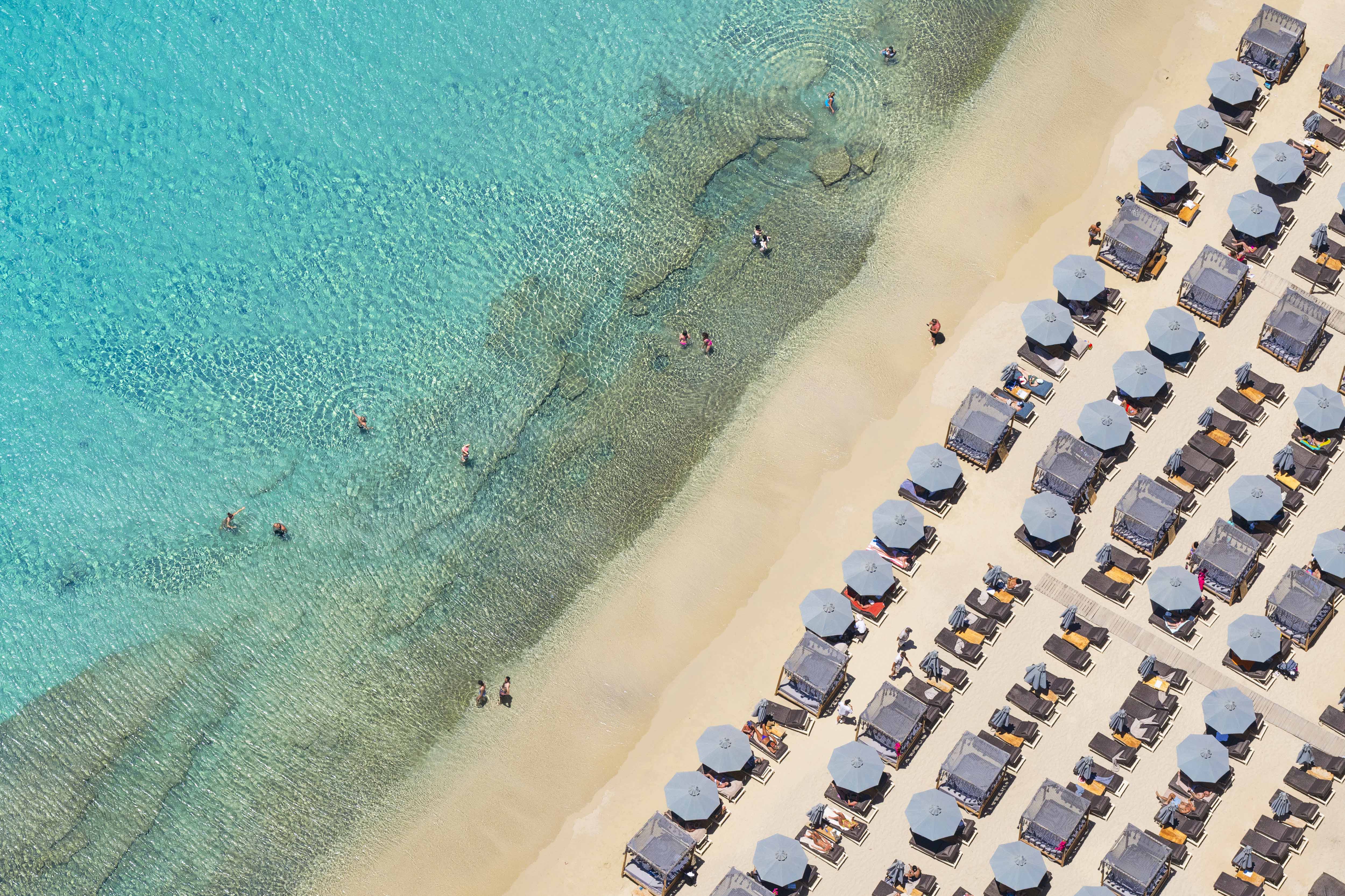 Enjoy stunning aerial views of the Grecian seashore in “Light Blue Umbrellas, Dove Beach Mykonos”, a timeless fine art photography print from Gray Malin’s Greek Islands series.