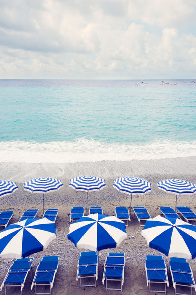 Crisp stripes in electric blue meet soothing shades of turquoise and cloud-filled skies in NAVY AND WHITE STRIPED UMBRELLAS VERTICAL. Shot in the seaside village of Cinque Terre, these mesmerizing umbrellas represent the luxurious mid-century Italian Riviera of the iconic La Dolce Vita series.