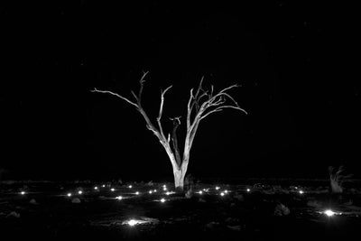 Conjure a mysterious, moody vibe in your space with the hauntingly beautiful NIGHT LIGHTS from Gray's awe-inspiring Namibia series. Shot on location in the arid clay pan, Dead Vlei,'s Gray artistically captured the iconic skeletons of the camel thorn trees that once thrived in a river setting. After 1,000 years of scorching sun they miraculously remained intact; a truly wondrous sight to see.