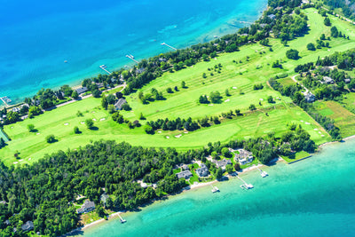 Enjoy the hole-in-one aerial view over NORTHPORT POINT GOLF COURSE, MICHIGAN from Gray’s popular series, À la Plage.