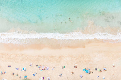 Add a flirty flair of pastel beach and water to your walls with the incredible NUDE BEACH SUNBATHERS, MAUI. From the stunning A la Plage series, this photograph captures the essence of summertime bliss from above. Image contains nudity.