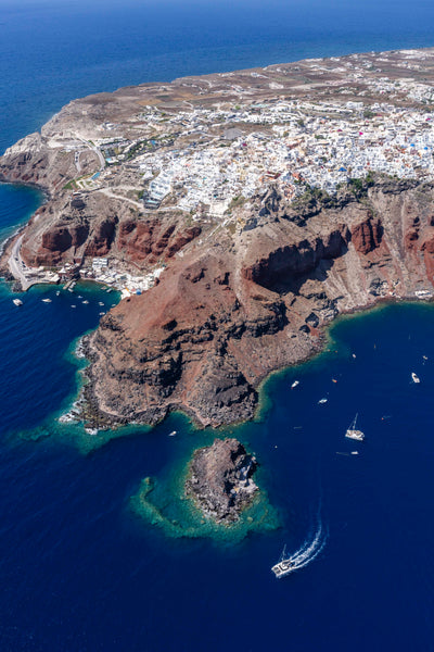 Take in a beautiful island view of “Oia Vista Vertical, Santorini”, a timeless fine art photography print from Gray Malin’s Greek Islands series.
