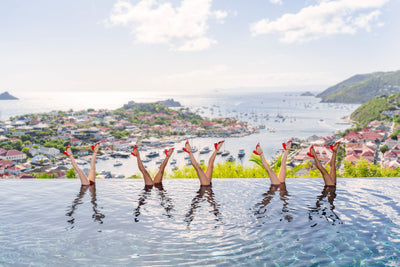 In a mesmerizing display of aquatic grace and vintage glamor, the Aqualillies, donned in stylish retro swimwear and timeless heels elevating their legs high above the water's glimmering endless surface in POOL PARTY, ST. BARTHS, from the enchanting series Gray Malin on St. Barths.