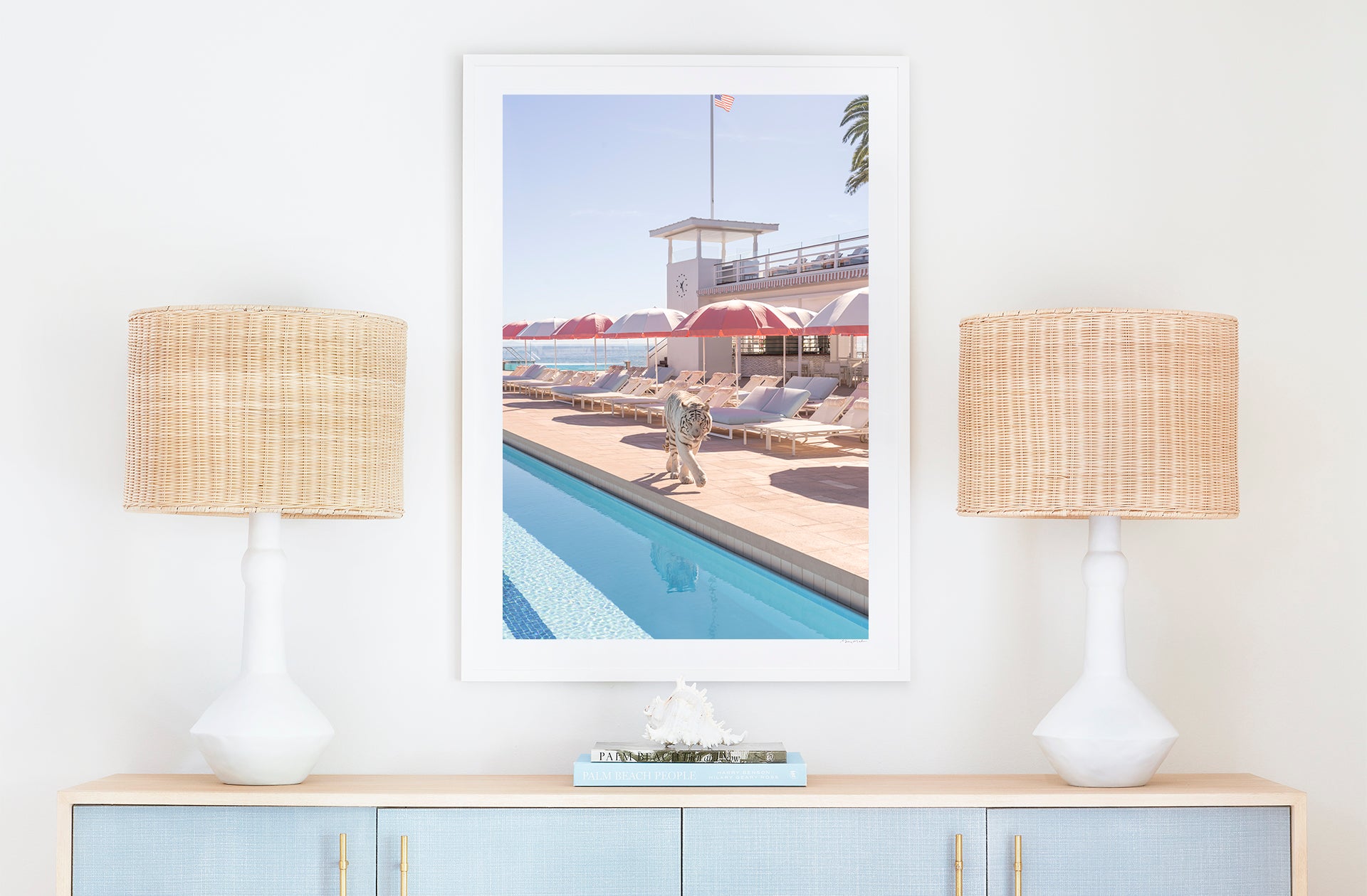 Take in the captivating scene of a regal white tiger poised by the pool with the sparkling ocean in the background in POOLSIDE PROWL, CORAL CASINO, in Gray’s Wild Series.