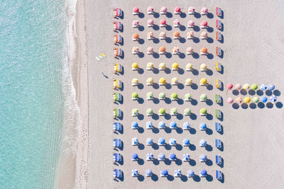 Absorb the range of rainbow hues aligned on the sand in Pride Beach™ Waves, Miami, a fine art photography print from Gray’s colorful series, Pride Beach™, shot from a helicopter above 11th Street in South Beach, Miami.