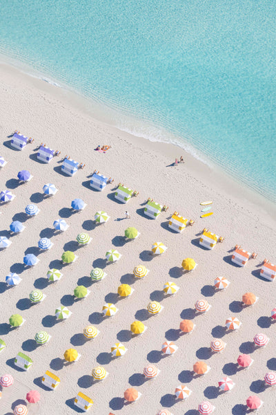The bright blue of the ocean meets the chromatic umbrellas on the shore in Rainbow in the Sand, Pride Beach™, Miami, a fine art photography print from Gray’s colorful series, Pride Beach™, shot from a helicopter above 11th Street in South Beach, Miami.