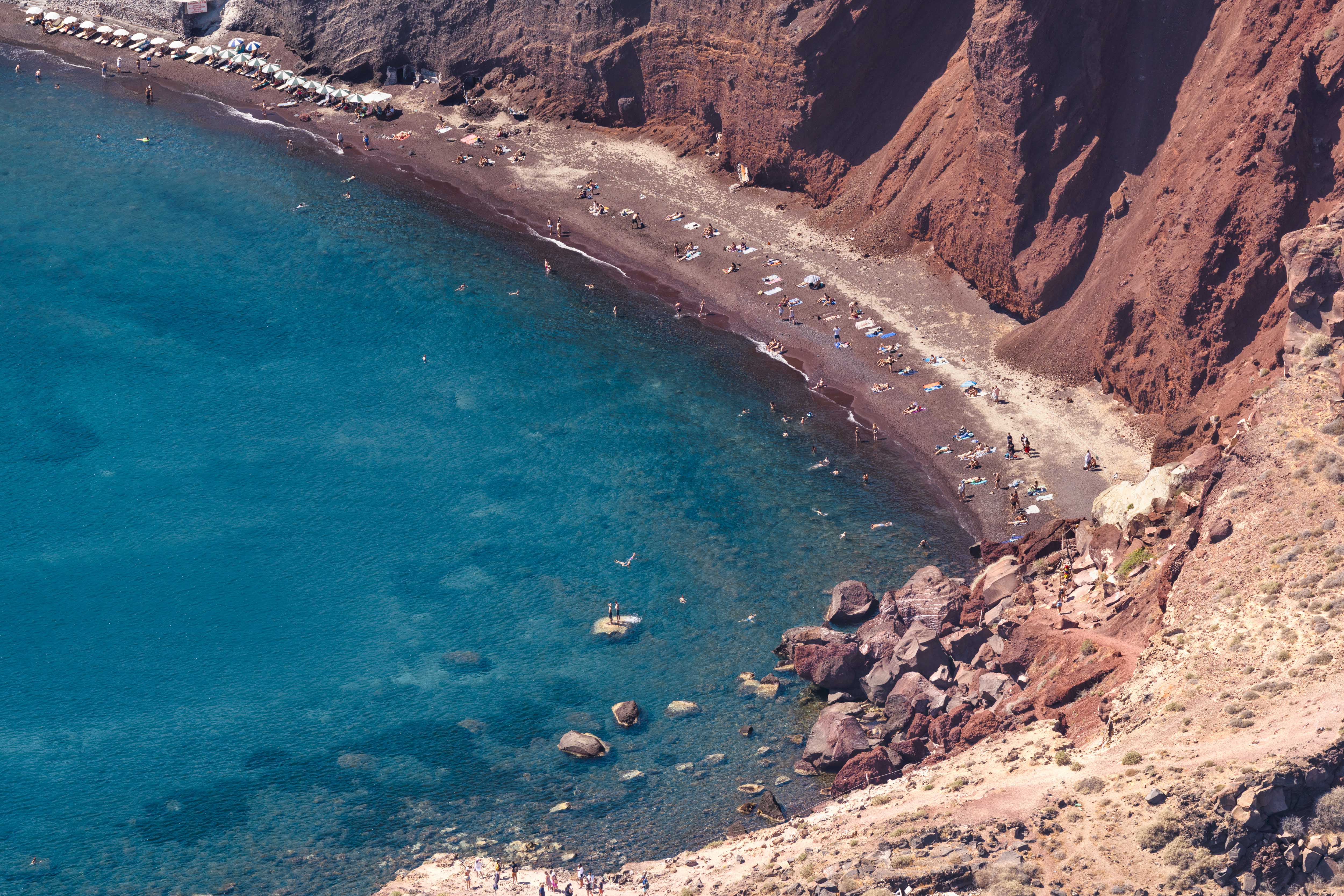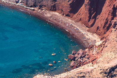 Dramatic cliffs descend into turquoise waters in “Red Beach Vista, Santorini”, a timeless fine art photography print from Gray Malin’s Greek Islands series.