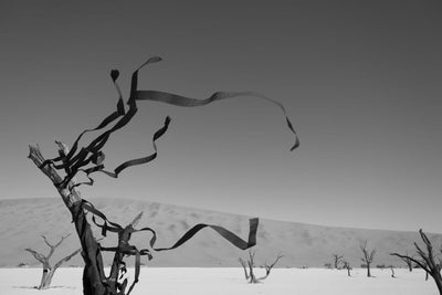 Freeze time with the captured monochromatic moment in RIPPLES IN TIME showcasing sun-scorched tree skeletons found at the base of the largest sand dunes in the world. Shot on location in Africa, Gray created the incredible Namibia series in the clay pan known as Dead Vlei. Inspired by the beauty of the arid land, he invites us all to see this wonder of the world in a whimsical new way.