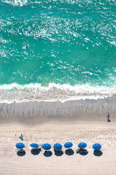 Dive right into the inviting tropical scene with cobalt blue beach umbrellas and warm turquoise waters. Gray captured this overhead shot of paradise from a doorless helicopter above stunning Southern California. SANTA MONICA VERTICAL of the iconic À la Plage series captures the essence of an endless summer.
