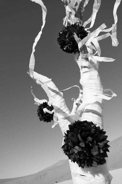 Let the hauntingly beautiful captured moment in SHREDS OF TIME exude a mystical mood in your space with festive garland decorating ancient sun-scorched tree skeletons. Shot on location in Africa, Gray created the iconic Namibia series to capture the essence of the unique clay pan, Dead Vlei.'s Gray invites us to see this wonder of the world in a whimsical new way.