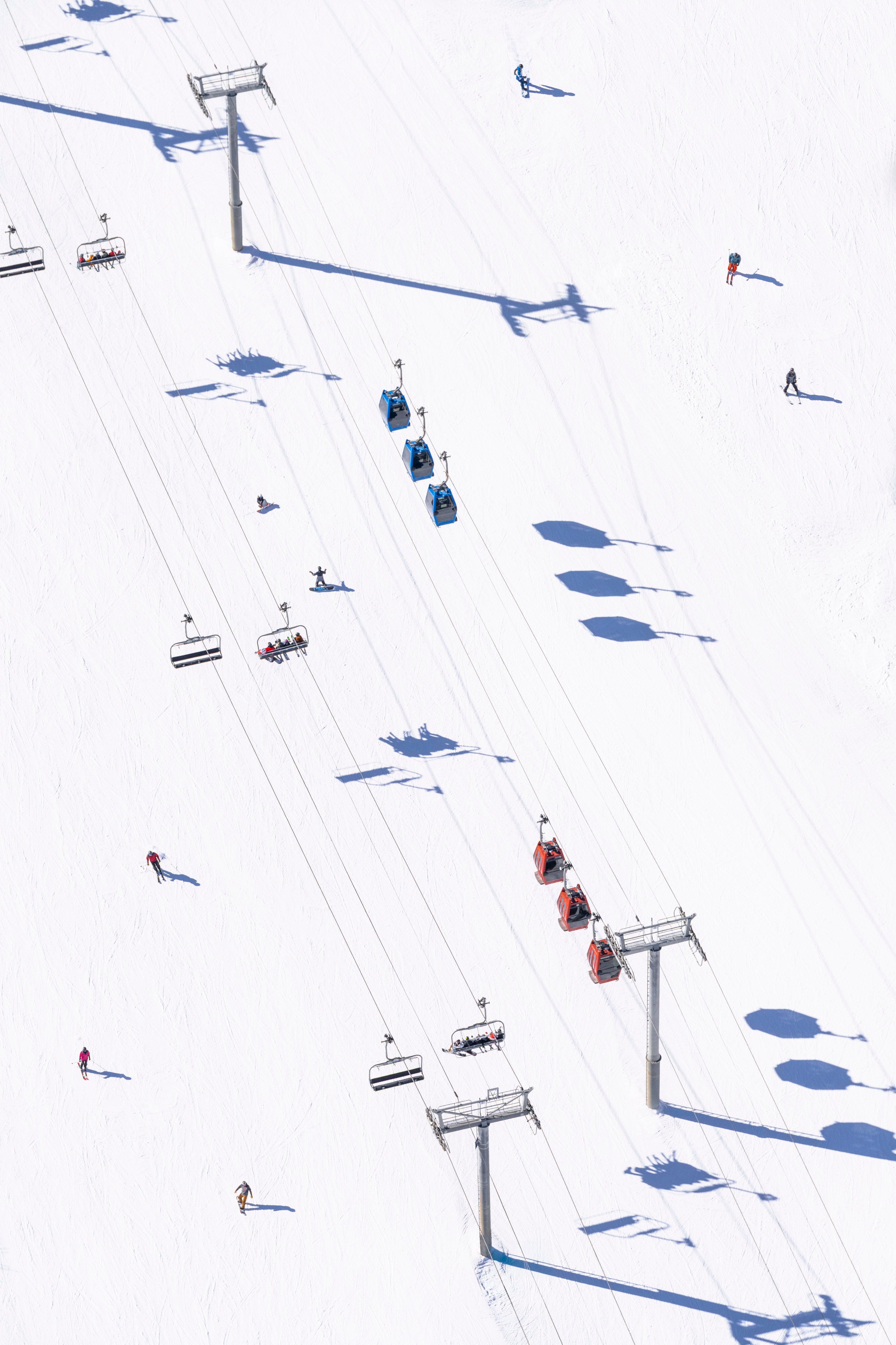 Colorful gondolas float above the mountain in Sky Cab & Village Express, Snowmass Mountain, from Gray’s iconic series, À la Montagne.