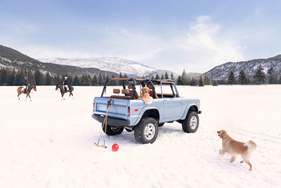 Rev up your snowy adventures with “Snow Bronco Pups, Aspen,” a nostalgic fine art photography print from Gray Malin’s classic Gray Malin in Aspen series. This piece features two charming pups ready to play polo at the snow covered The Aspen Valley Polo Club in a classic Bronco. Ideal for those who love vintage cars, style and coastal living, this print adds a touch of whimsy and wanderlust to any room.