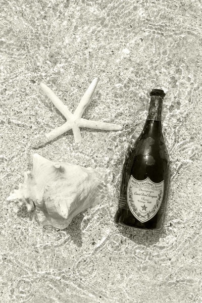 The sun-kissed shores of Caribbean splendor accentuate accessories evoking a sense of nostalgia and wonder of the year 1969 in SPLASH OF 1969 DOM PERIGNON, ST. BARTHS (SEPIA), from the enchanting series Gray Malin on St. Barths.