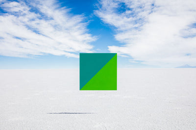In TEAL AND GREEN SQUARE, bold colors contrast the sharp blue sky and bright white salt flats in this unique photograph shot on location in Salar de Uyuni, Bolivia for Gray’s Far Far Away series.