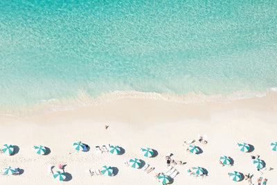 The aqua ocean waters perfectly complement the colorful umbrellas in TEAL UMBRELLAS, BAHAMAS, a vibrant fine art photography print from Gray’s beloved À la Plage series. This image brings a tropical escape to your home, ideal for creating a relaxing atmosphere.