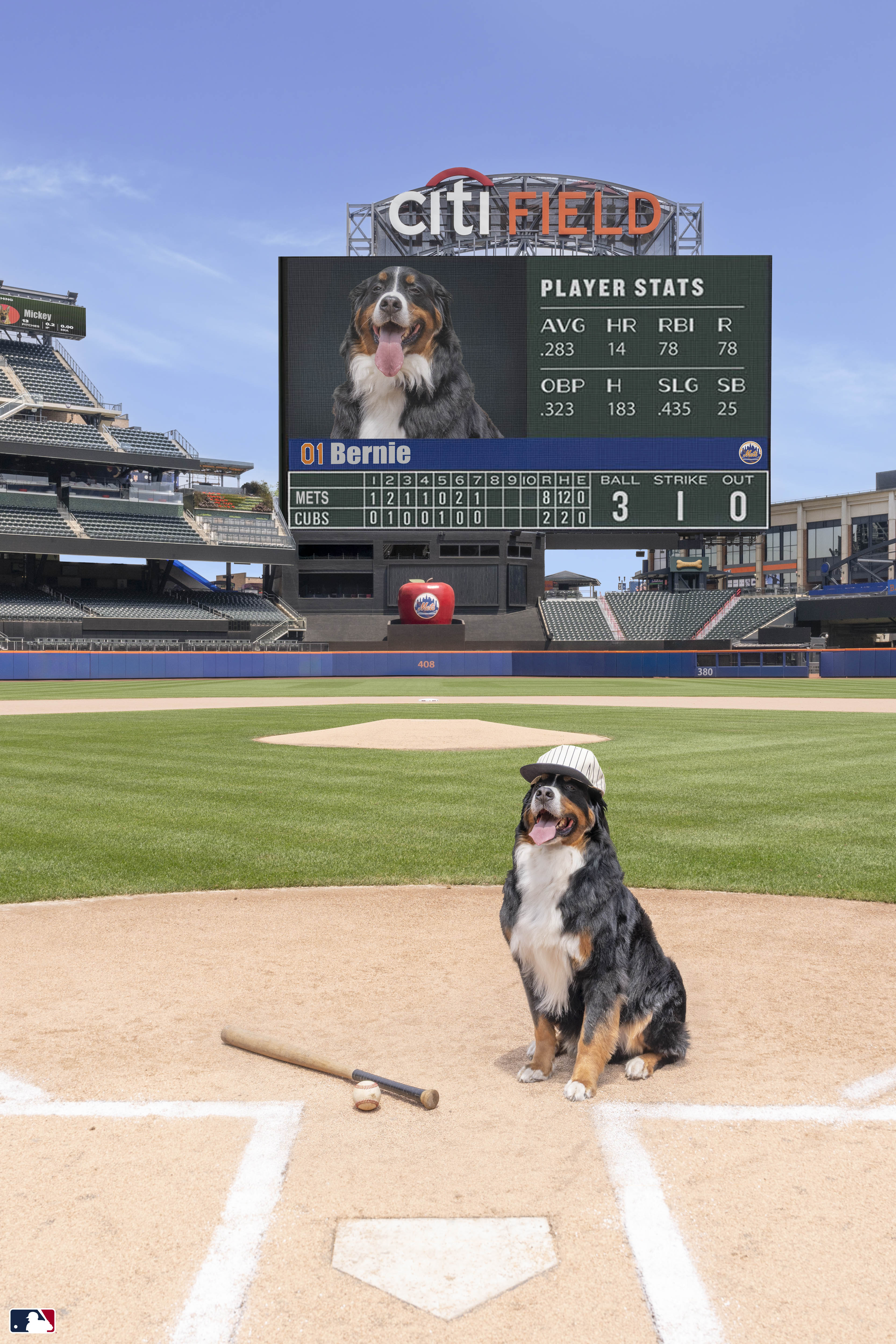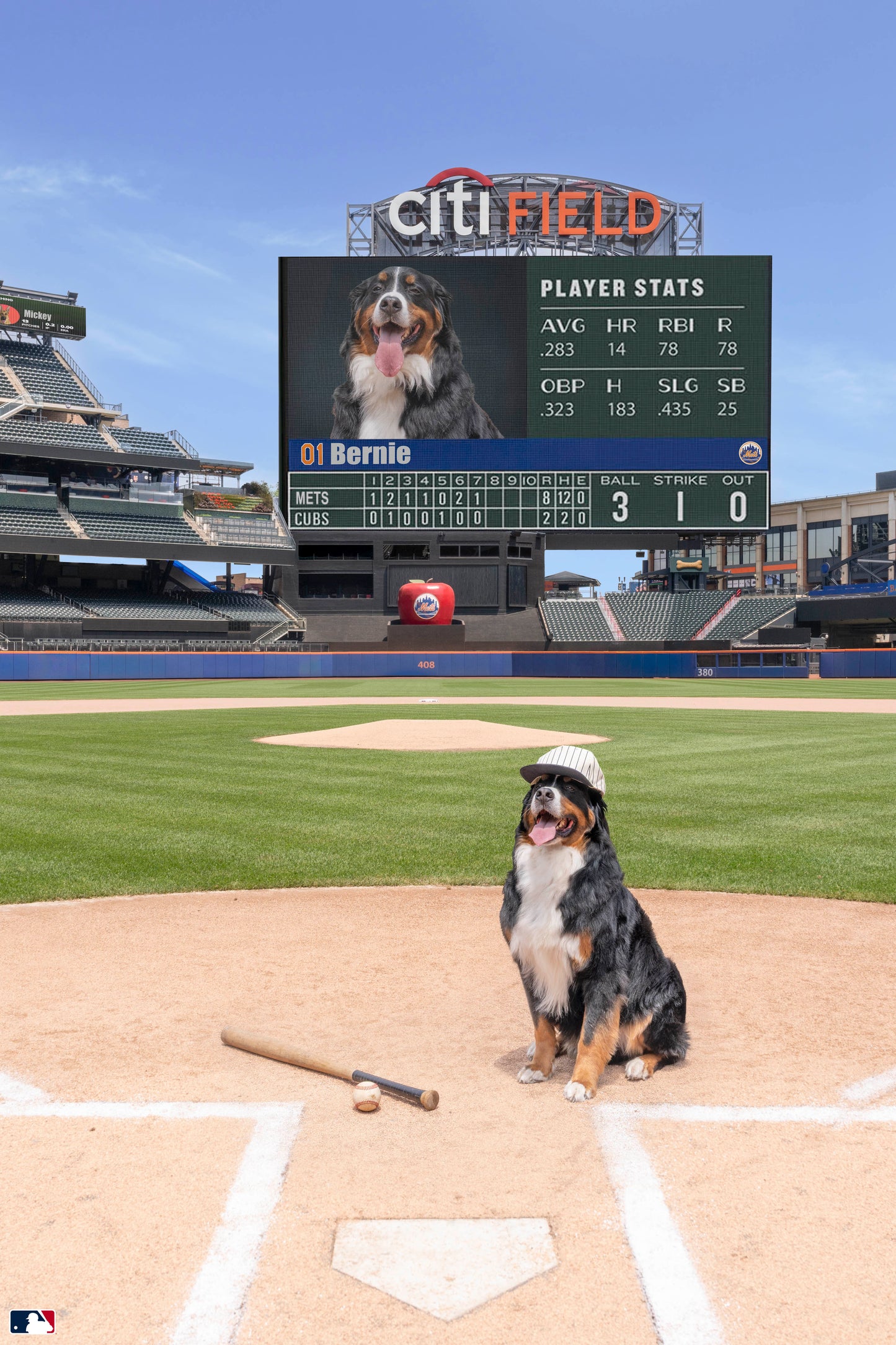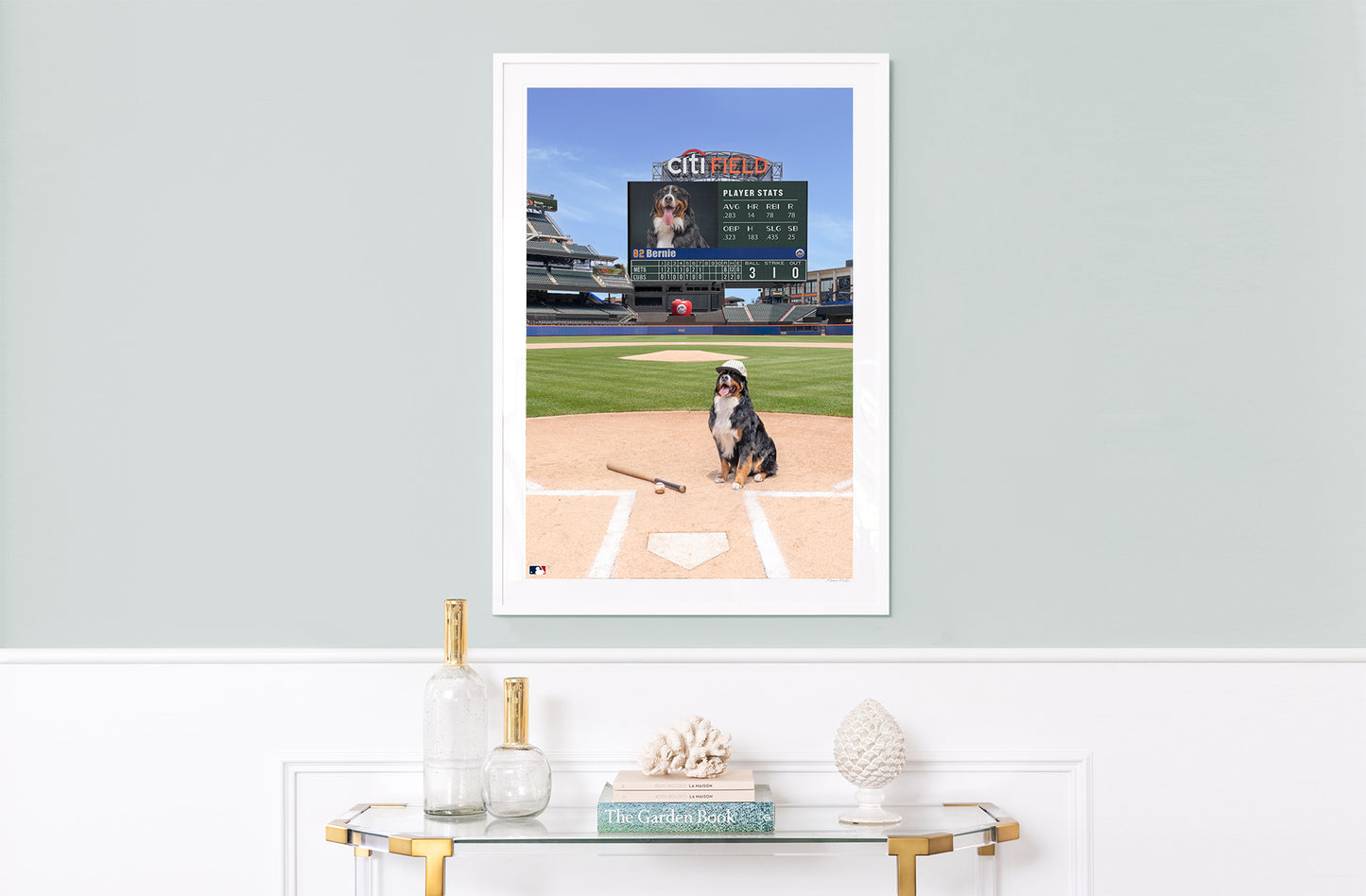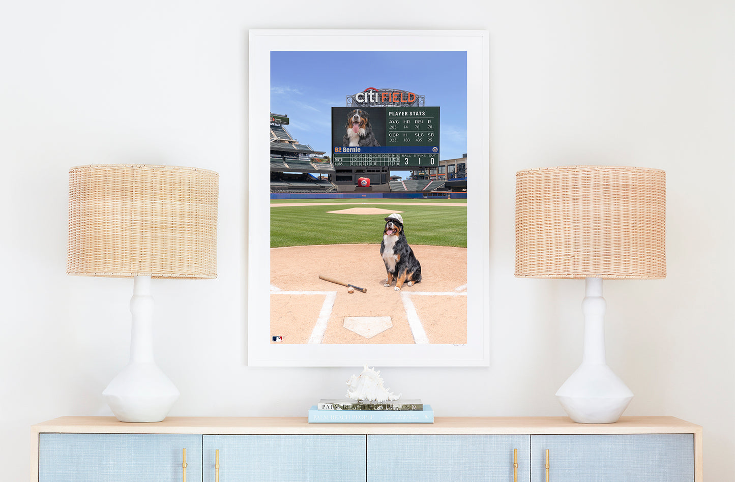 A Bernese Mountain Dog proudly stands ready to hit a home run in The Center Fielder, a fine art photography print from Gray Malin’s Dogs of Baseball series.