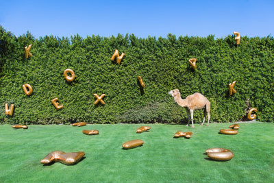 Gray's vision for this series was to create a perfect oasis of his favorite exotic animals living at a contemporary hotel. THE GARDENER combines his love for balloons and the abundant green fields of the Parker Palm Springs Hotel.