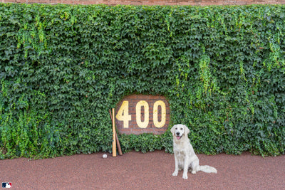 A golden retriever poses proudly at the 400 sign in The Heart of Wrigley, from the Wrigley Field™ collection of Gray's iconic series, Dogs of Wrigley Field™