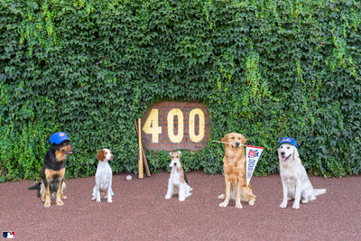 A pack of pups pose proudly at the iconic 400 marker in The Ivy League, from the Wrigley Field™ collection of Gray's iconic series, Dogs of Wrigley Field™.