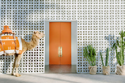 Feel like a VIP with “The Porter III,” a playful fine art photography print from Gray Malin’s “Gray Malin at the Parker” series. This piece captures a whimsical scene at the iconic Parker Palm Springs, featuring a camel paired with decorative cactus, blending retro charm with modern luxury. Perfect for those who love eclectic decor and Palm Springs style.