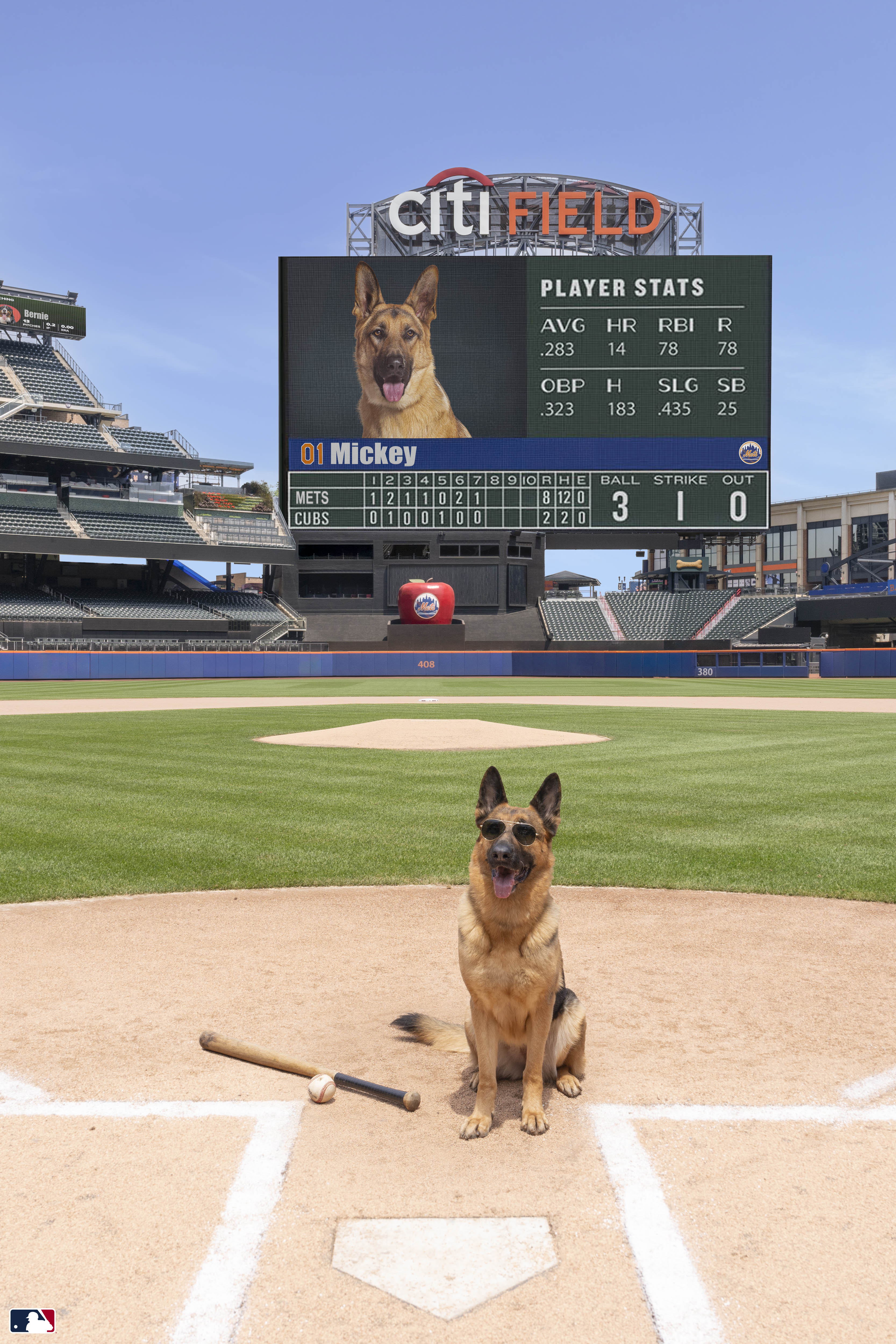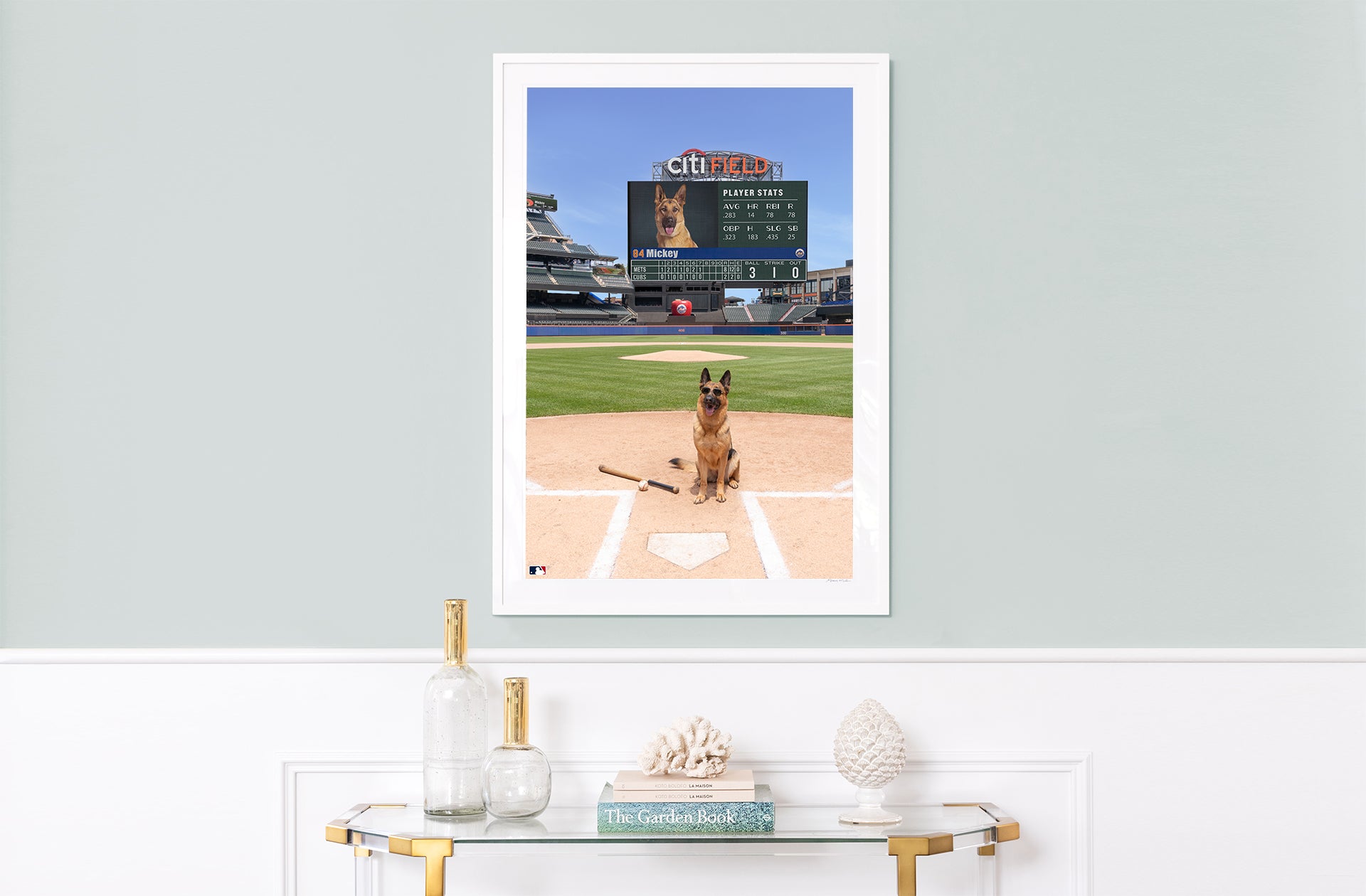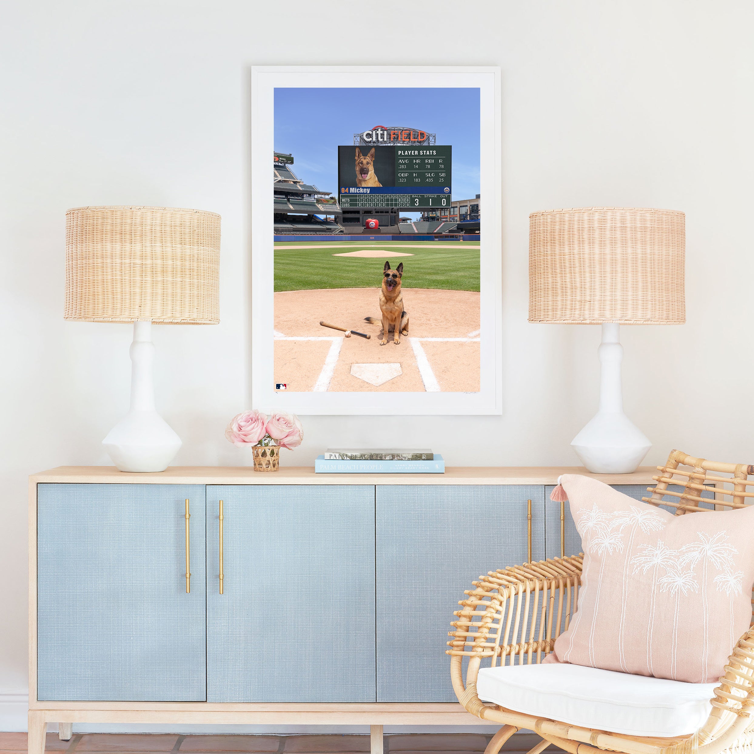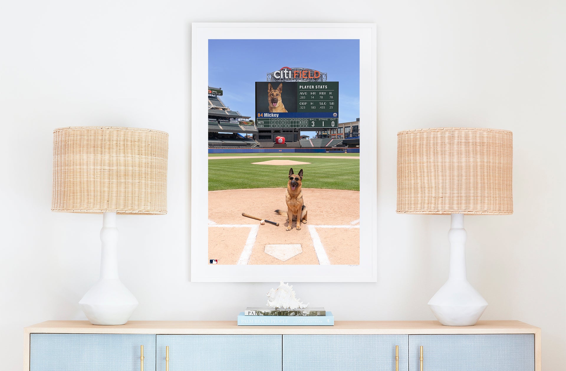 A German Shepherd protects home base in The Shortstop, a fine art photography print from Gray Malin’s “Dogs of Baseball” series.