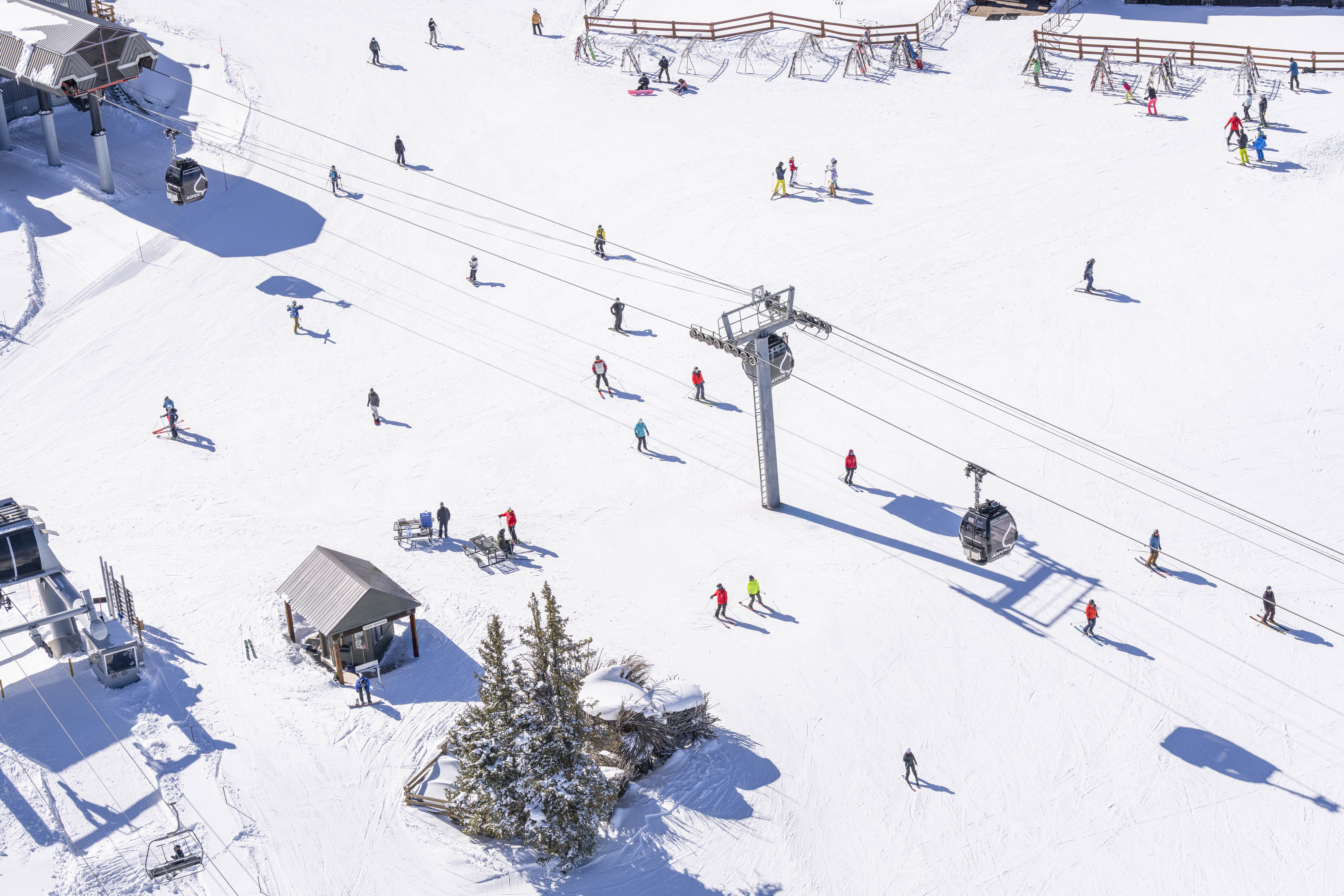 A crisp summit scene of lifts, skiers, and early-day light Top of Ajax Mountain, from Gray’s iconic series, À la Montagne.